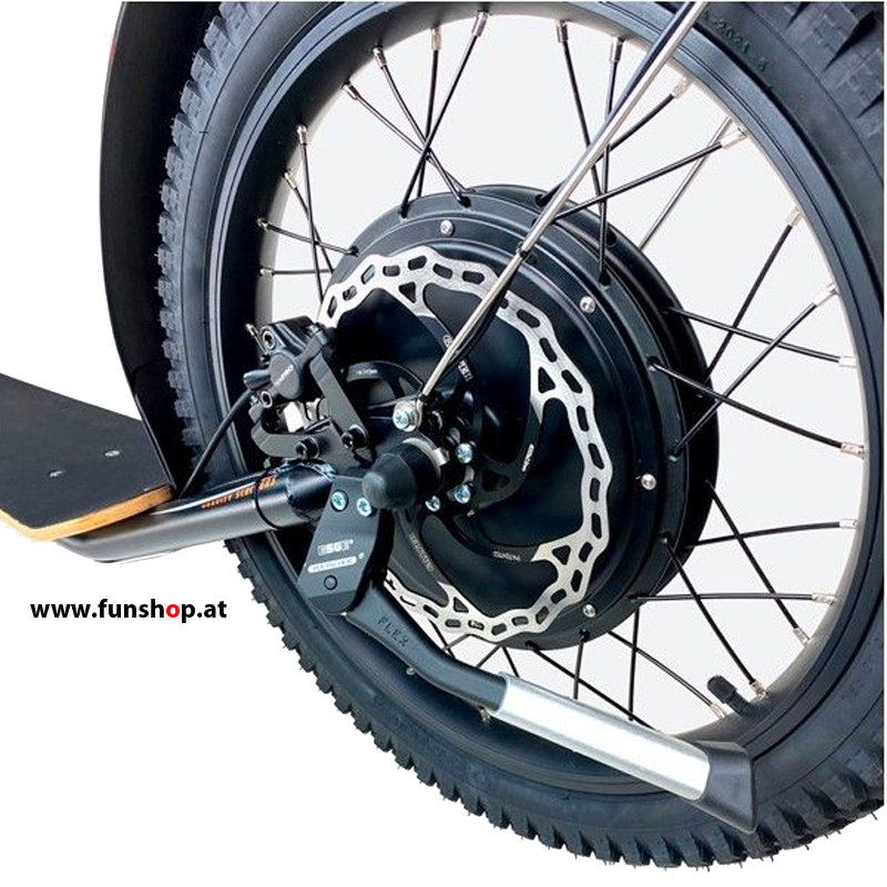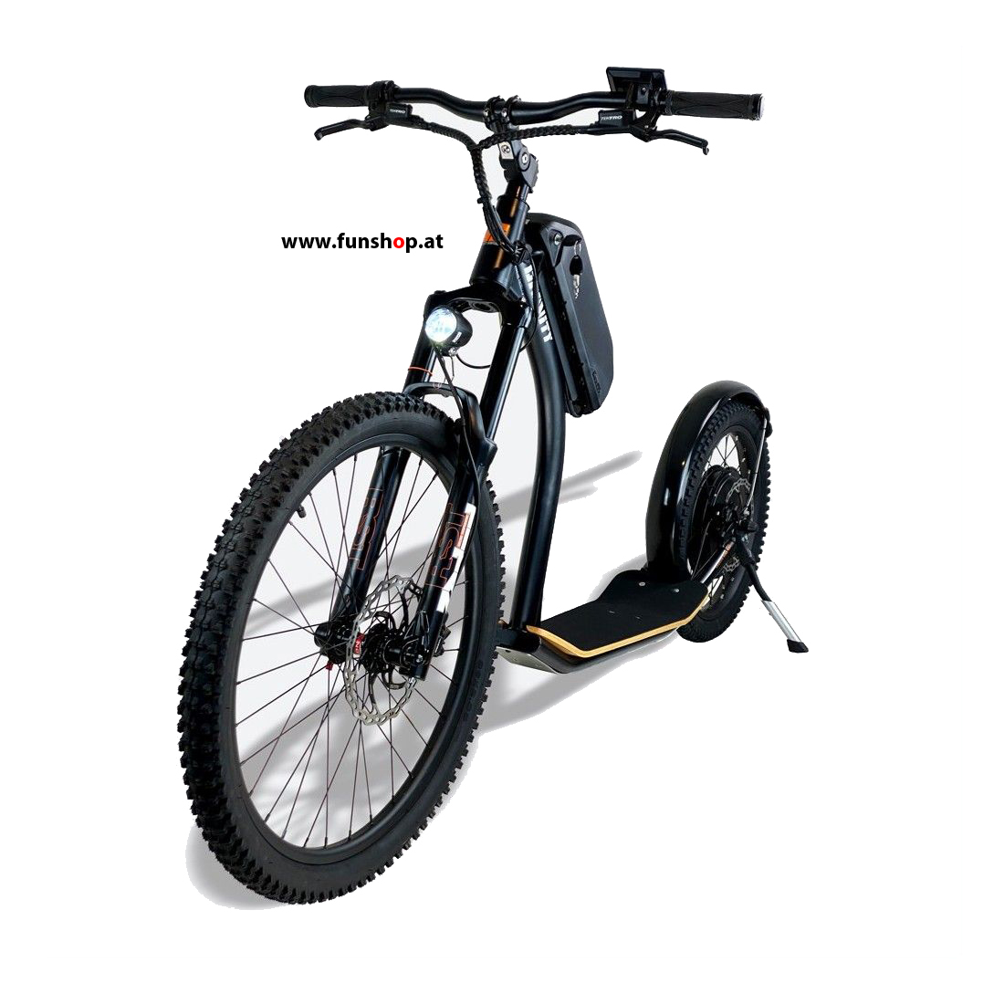 Dieser Kickscooter mit unglaublichen 1.000 Watt und den großen 20″ bzw. 26″ Offroadrädern hat mehr als genug Kraft um auch im unwegsamen Gelände zu bestehen. Der niedrige Schwerpunkt, die Gabel mit 150 mm Federweg, die beiden Scheibenbremsen sowie das mit CrMb-Stahl verstärkte Chassis sind ausgelegt auf größere Beanspruchung und jede Menge Fahrspass.