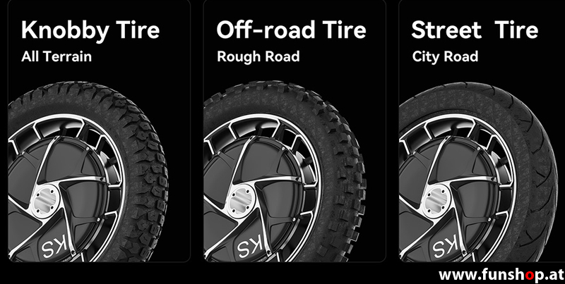 Erstamals kann ein elektrisches Einrad mit 3 unterschiedlichen Reifen in den Größen 2.75-14, 3.0-14 und 90/100-14 ausgestattet werden wobei die Auslieferung immer in der Dimension 2.75-14 erfolgt. Hier kann zwischen Strassenreifen und Offroadreifen gewählt werden: